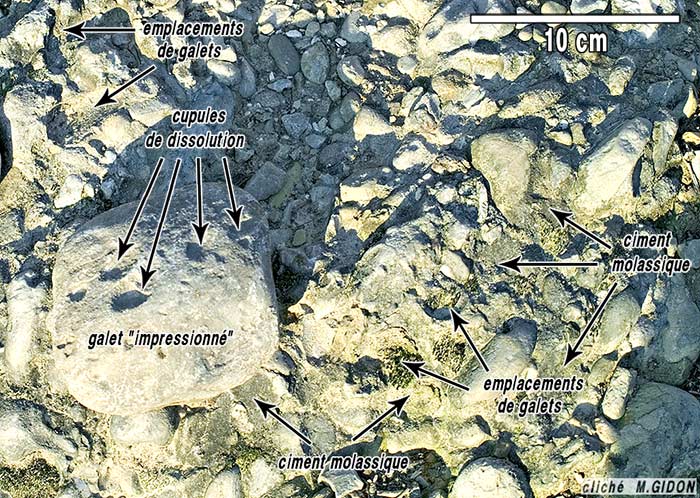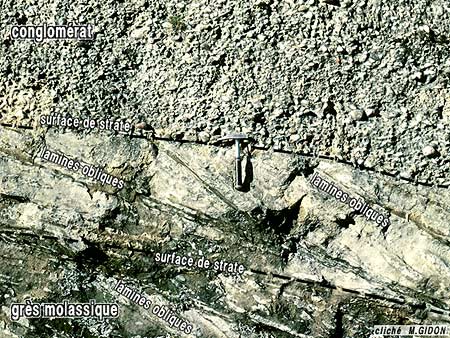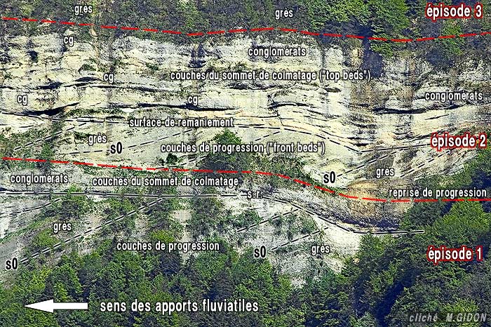 Ces masses conglomératiques sont lenticulaires (mais mesurent aisément plusieurs centaines de mètres de large et plusieurs dizaines de mètres d'épaisseur). Elles correspondent à la coupe du remplissage de lits des bras de rivière qui amenaient des matériaux grossiers dans le delta lors des crues.