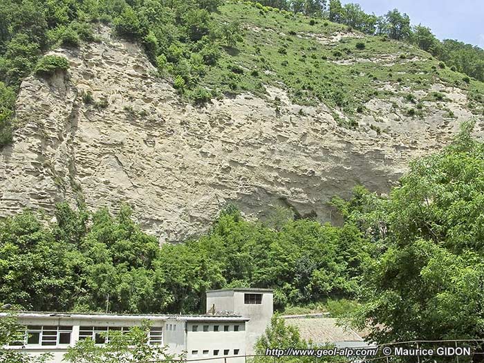 ![]() La falaise de molasse de la rive droite des gorges de la Morge, à Voiron, vue du sud-est en rive gauche, depuis la route de l'hôpital. Falaise de molasse sableuse homogène, ça et là mieux consolidée en strates gréseuses plus résistantes, lenticulaires. |