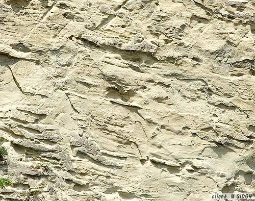 Vue rapprochée d'un affleurement de molasse sableuse des gorges de la Morge, à Voiron, montrant des zones lenticulaires mieux cimentées au milieu d'un ensemble plus friable |