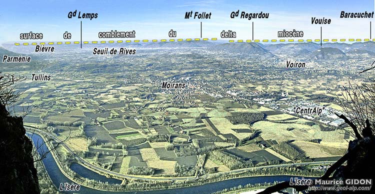 Les collines du Bas Dauphiné face au débouché de la cluse de l'Isère, vues depuis le sommet de la Dent de Moirans (extrémité septentrionale du Vercors). On voit que les sommets de ces collines s'alignent selon une surface qui représente le sommet du comblement et qui s'élève de la gauche vers la droite depuis l'altitude de 650 jusqu'à celle de 850 m : cela correspond à la surrexion isostatique post-Miocène qui a déclanché l'incision des dépôts molassiques par des vallées fluviatiles. En particulier l'Isère s'engageait directement dans la plaine de Bièvre avant d'abandonner ce cours pour s'encaisser, en contrebas du seuil de Rives, le long de la bordure occidentale du Vercors. |