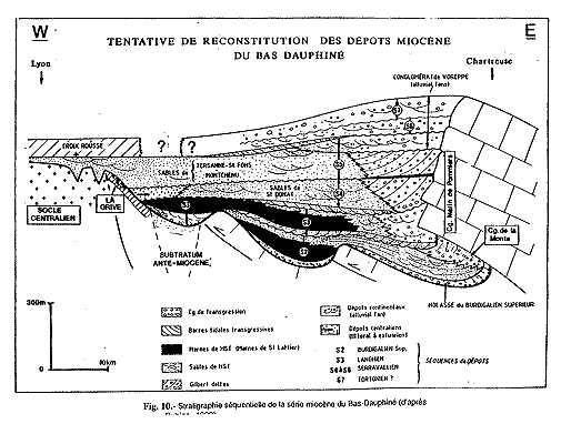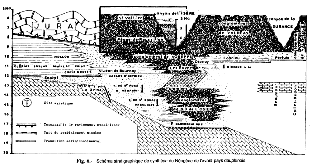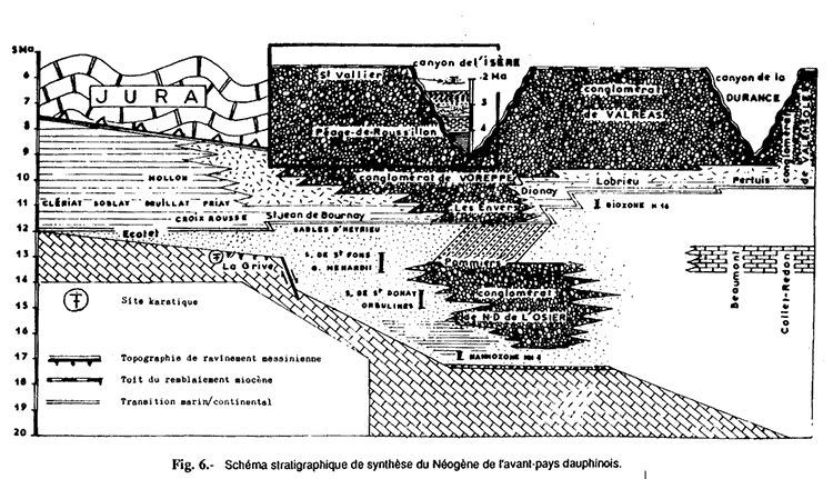 En son sein, la mégaséquence miocène présente deux types de faciès: marins à la base, continentaux au sommet. Selon un axe méridien (mais également selon un axe W-E), cette transition - qui correspond à la surface d'émersion - est diachrone. Sur une distance d'environ 300 km séparant les gisements extrêmes d'Ecotet et de Pertuis qui la jalonne, ce diachronisme est de l'ordre de 2 Ma (fig. 6). Ce diachronisme d'émersion a également une composante Est-Ouest, moins facile à appréhender dans la mesure où la distance transverse est plus réduite et les points de datation paléontologique alignés selon cet direction beaucoup moins nombreux. Tel est le cas néanmoins des gisements de Dionay et des Envers séparés dans l'espace par une quinzaine de kilomètres et, dans le temps, par 0,5 Ma.