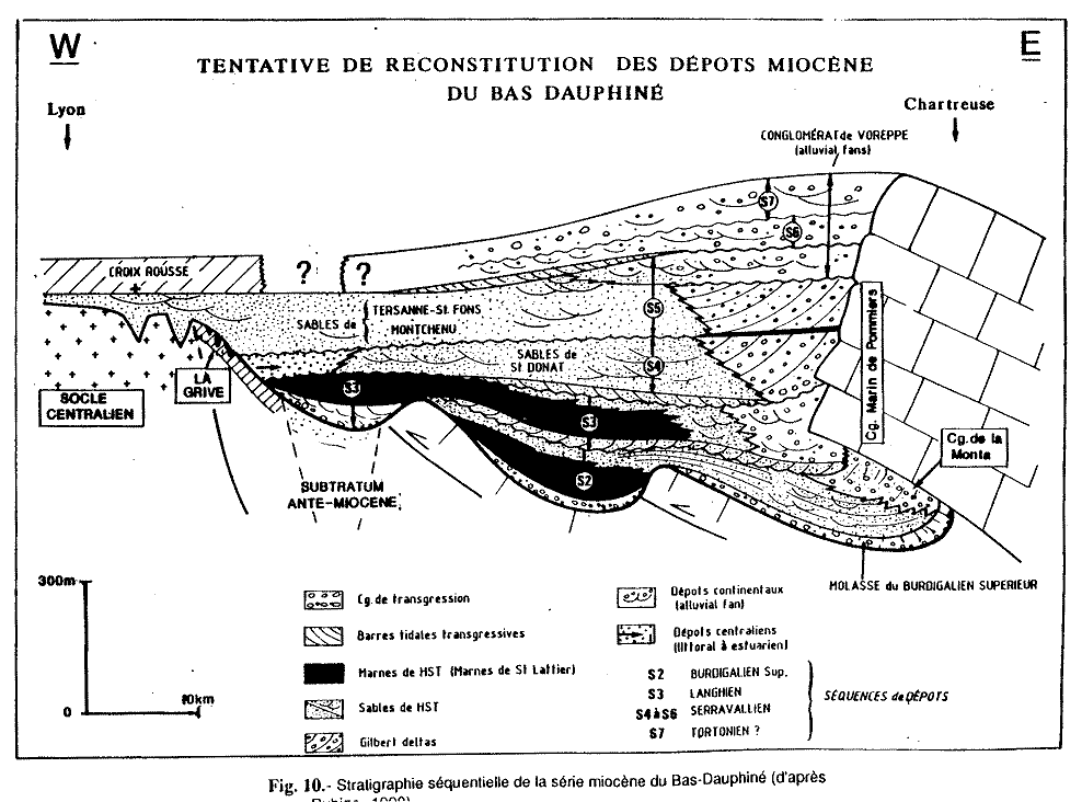 Le diachronisme E-W du front conglomératique peut être estimé. En effet, dans le plus oriental des synclinaux de Grande Chartreuse, celui de La Monta, l'apparition des conglomérats est très précoce, dans une série dont la transgression initiale est de peu antérieure à - 17,5 Ma. A l'autre extrémité du sillon périalpin, ce même faciès n'atteint en onlap la retombée orientale du Massif Central que peu de temps avant le début du creusement messinien, c'est-à-dire vers 7/6 Ma. II aura donc fallu 10 Ma à ces conglomérats pour prograder sur toute sa largeur le sillon périalpin.