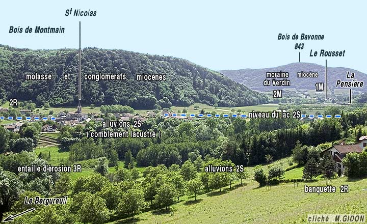 Il s'agit d'un tronçon de vallée morte, ancien chenal marginal d'écoulement des eaux, en marge d'une moraine rissienne. Ce fragment de matériel rissien doit sa conservation à ce que, ici encore, il était logé dans un creux élevé : c'est ce qui l'a mis à l'abri des érosions fluviatiles interglaciaires avant et après le retour du glacier wurmien.
