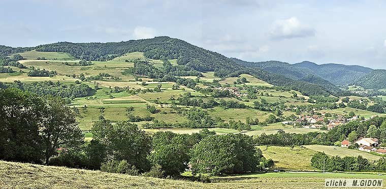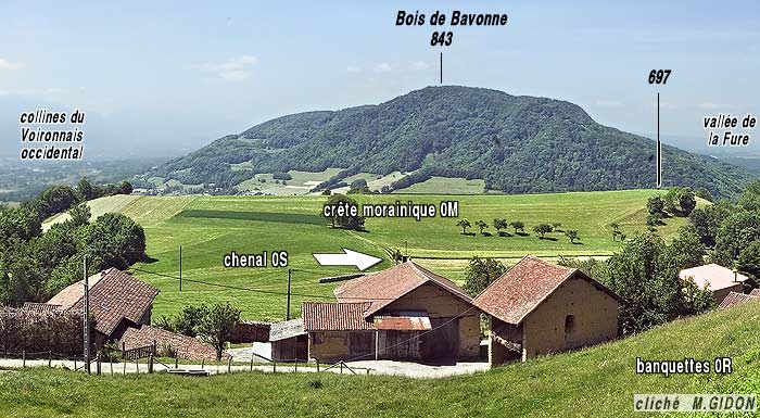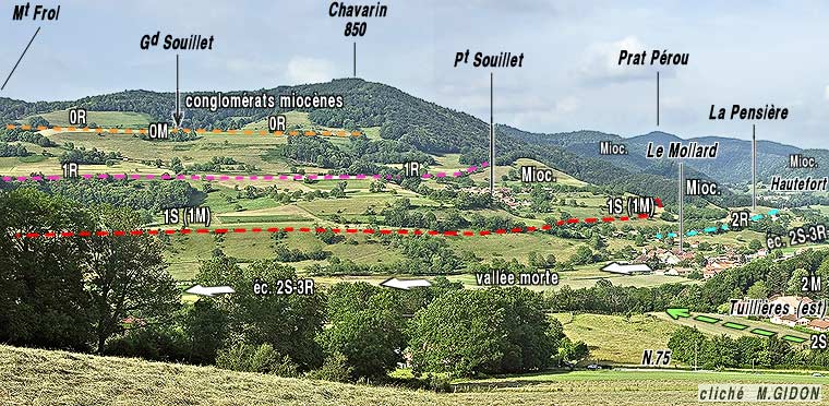 ![]() Le plateau suspendu du Grand Souillet vue du nord-est, depuis les pentes dominant le village du Grand Souillet Ce lambeau résiduel de matériel glaciaire et fluvio-glaciaire anté-wurmien (Riss probable, par conséquent) n'est conservé que parce qu'il a échappé à l'érosion de deux ravins qui l'encadrent à l'ouest et à l'est : ils descendent respectivement du Mont Frol (à droite) et de la montagne de Chavarin (à gauche). |