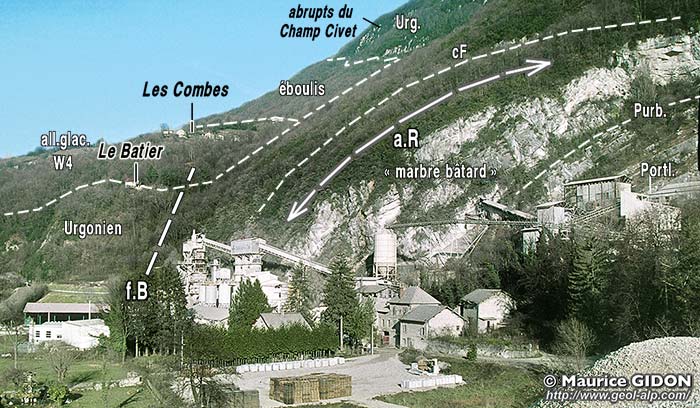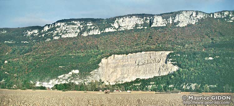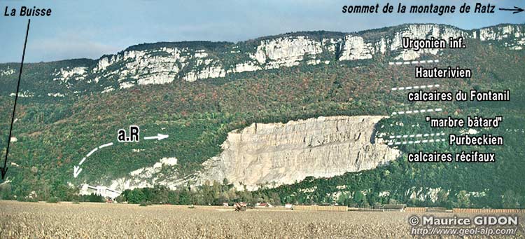 La succession des couches y est très peu différente de celle du Bec de l'Échaillon ; toutefois les niveaux marins du balcon y sont remplacés par les faciès d'émersion de type Purbeckien (à minces lits de marnes vertes séparant des bancs calcaires à cailloux noirs) qui sont communs dans le Jura ; d'autre part les marbres compacts sont ici absents de la masse inférieure des calcaires jurassiques et remplacés par des calcaires lités déposés dans la partie plus interne de la plate-forme.