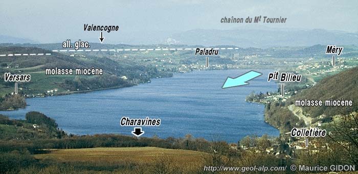 ![]() Le lac de Paladru vu du sud, presque dans l'axe d'allongement du lac, depuis le relais hertzien de Mont Follet (extrémité orientale du Mont Levatel). all.glac = alluvions glaciaires, principalement morainiques, correspondant au niveau du remplissage par la glace lors du maximum wurmien (celles des collines de Valencogne ont été abandonnées aux 2° et 3° stade de retrait du Würm) ; elles couronnent les collines formées intégralement de molasse miocène, ici riche en bancs de conglomérats. La grosse flèche indique le sens d'arrivée de la glace. |