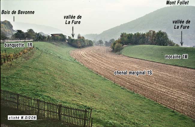 Les pentes de rive gauche de la vallée de la Fure, vues du nord vers le sud, depuis la route Charavines - Clermont, en contrebas ouest du hameau le plus occidental du village de Clermont. On observe là un dispositif exemplaire et schématique de marge de langue glaciaire. Il est formé par les dépôts du stade de retrait 1 (de gauche à droite : 1R, 1S et 1M), qui réalisent le schéma le plus simple de morphologie de marge glaciaire (voir le schéma B). La langue glaciaire s'engageait de droite à gauche dans la vallée de la Fure, derrière la moraine 1M. |