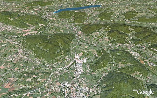 ![]() L'affrontement des langues glaciaires aux environs de Charavines d'après une image extraite de "google-earth" Seuls sont indiqués les contours des langues glaciaires au stade "Würm 1"(maximum d'extension de cette glaciation) : en blanc= langue de la Fure et de Paladru ("Rhône A") ; en bleu clair = langue de l'Ainan ("Rhône F") ; en bleu foncé = glaces arrivant de la cluse de l'Isère (voir la carte d'ensemble). |