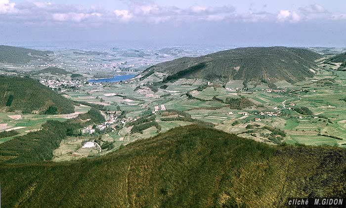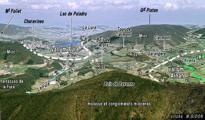 ![]() La vallée supérieure de la Fure et l'extrémité méridionale du val d'Ainan, vues d'avion, depuis le sud, de l'aplomb de La Murette, par dessus la crête de la montagne du Bois de Bavonne. De cet endroit on voit d'un seul regard l'emplacement des deux langues glaciaires rhodaniennes, de la Fure (Charavines) et du val d'Ainan (Chirens) qui s'avançaient en venant du nord au maximum de Würm. Leurs fronts sont repérés par les crêtes morainiques 1M qui ceinturaient leurs extrémités. La vallée morte de Bavonne, qui évacuait vers la Fure les eaux issues du vallum de Chirens (voir ci-après), est masquée par le Bois de Bavonne, dont elle suit le pied nord. |