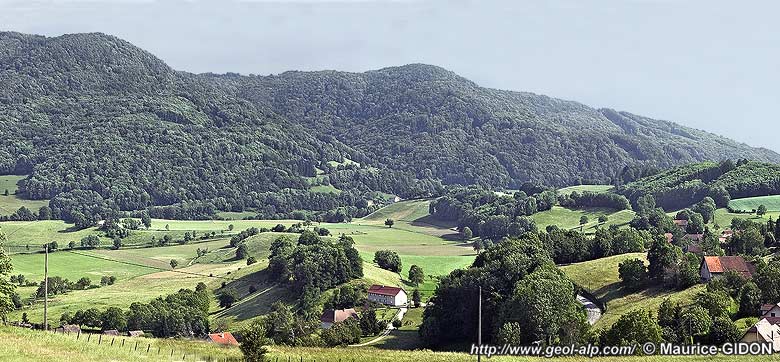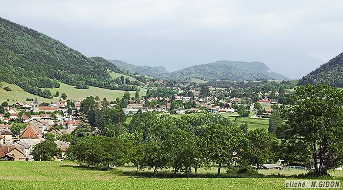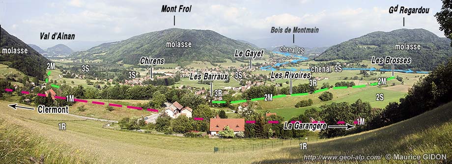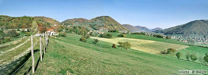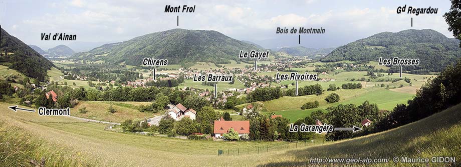 ![]() La trouée de la vallée du Rousset, vus du nord, depuis la rive droite du val d'Ainan (route de Clermont). Le raccord entre la vallée du Rousset et la dépression de Saint-Nicolas-de-Macherin est masqué derrière les pentes du château de Montclair (voir la page Saint-Nicolas de Macherin). |