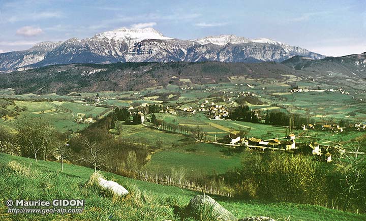![]() Les pentes de Coublevie vues du nord-ouest, depuis le sommet de la statue de Vouise (les couleurs sont celles de la carte ci-après) (voir le symétrique du cliché ci-dessus à la page "Voiron"). |