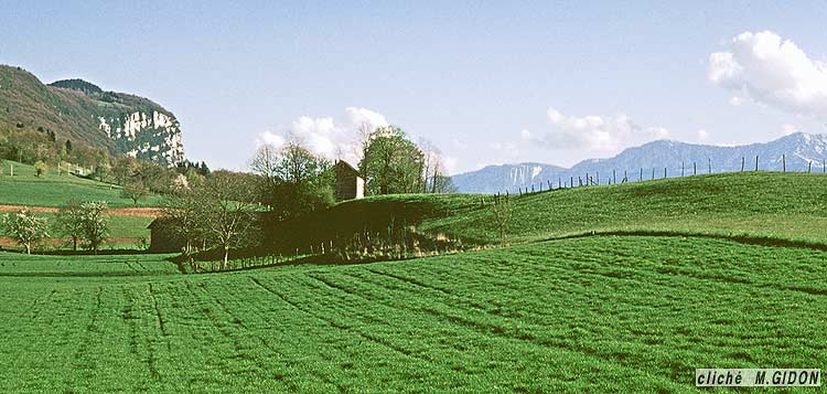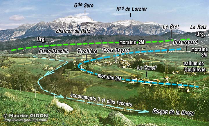 En fait on constate que, au sud de cette brèche, cette crête morainique se dédouble. Ceci est certainement lié au fait que le vaste espace plat ouvert devant le glacier par la dépression de Saint-Étienne-de-Crossey permettait à la marge de la glace de se déplacer horizontalement de façon importante à la moindre oscillation du niveau de la glace.