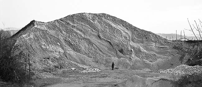 ![]() L'ensemble du front de taille vu du nord-ouest (depuis le bord de la route N520). On est ici à l'est, à l'extérieur par rapport à la concavité de l'arc de la moraine M3 : lors du dépôt de ces alluvions (et après) le glacier se trouvait à droite. |
