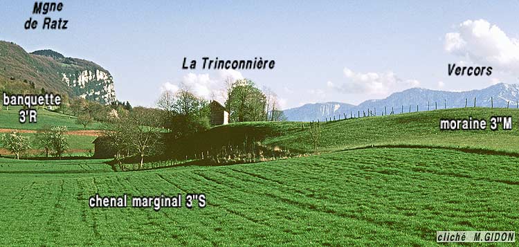 ![]() L'extrémité septentrionale de la cuvette de Coublevie, vue du nord-ouest, depuis le village de Vouise (qui est installé sur la banquette de retrait 3'R). L'arc morainique de Croix Bayard (3M) a été abandonné par la langue glaciaire, diffluente à partir du glacier de la cluse de l'Isère, qui occupait la dépression de Coublevie. La Morge a été contrainte de contourner par le nord la crête morainique 3M, puis s'est encaissée sur place dans le bedrock* molassique au fur et à mesure que son niveau de base s'abaissait par suite de la fonte du glacier isérois (voir un cliché de ces gorges à la page "Voiron_NE") |