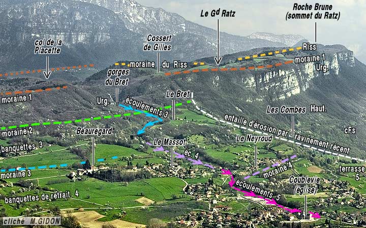 ![]() La marge orientale du Voironnais et la montagne de Ratz, vues d'avion du sud-ouest depuis l'aplomb de la Crue de Moirans. On a représenté en tirets gras de couleurs les arcs morainiques du Voironnais. Ils se terminent vers le SE en s'appuyant sur le relief de bedrock* de la montagne de Ratz (à l'exception de ceux du premier stade de retrait [W1] du Würm et d'un chapeau de moraine rissienne). a.R = anticlinal du Ratz (charnière occidentale) ; f.B = faille de la Buisse |