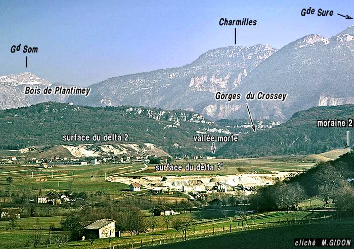 Le delta inférieur s'est formé au stade 3, alors que la vallée de la Morge était barrée par la moraine M3 (de Croix Bayard) Son niveau (450 m) est celui de la crête de moraine de part et d'autre de la brèche de Croix Bayard, par laquelle arrivaient dans le lac les eaux de fonte du glacier isérois. Les eaux provenant de la vallée de Saint-Laurent-du-Pont par les gorges du Crossey ont continué à se déverser vers Saint-Étienne de Crossey jusqu'au stade 4 inclus : en témoigne la vallée morte de l'Étang-Dauphin qui entaille la terrasse 3 et où les pièces d'eau actuelles, qui résultent de barrages construits de main d'homme, ne sont alimentées que par des sources locales.