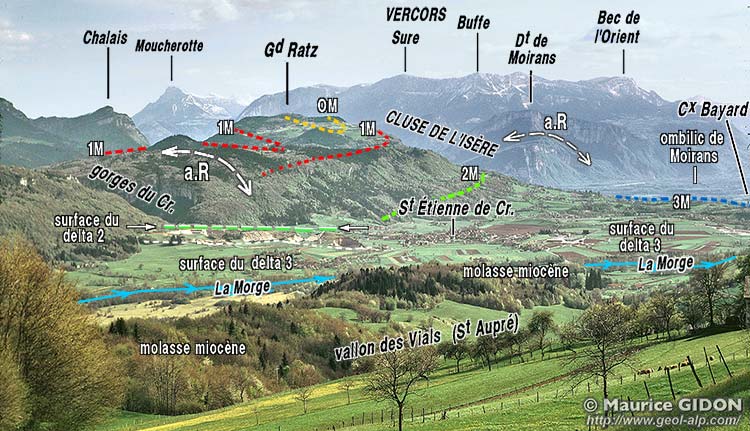 ![]() Carte de la région située au nord-est de Voiron au Quaternaire récent Les numéros indiquent les épisodes de retrait du front de la langue glaciaire iséroise qui occupait la dépression de Voiron. À l'angle nord-ouest de la carte est représentée l'extrémité méridionale de la langue de glacier rhodanienne de l'Ainan (voir la carte d'ensemble de la région voironnaise) L'épisode de retrait 3 se subdivise assez visiblement en deux sous-stades, chacun avec sa crête morainique (M3' et M3"). Durant les épisodes de retrait 3 les eaux de la Morge s'échappent en passant à flanc des buttes de Tolvon et de Vouise, où elles s'enfoncent en créant les gorges (qui se sont encaissées plus profondément par la suite), pour aller alimenter le lac de la dépression des Blanchisseries, au nord de Voiron. |