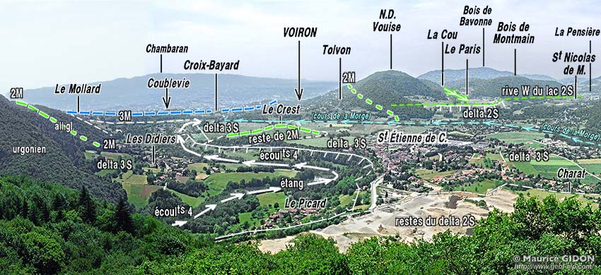 En définitive ce lac de Saint-Étienne de Crossey était rempli par des eaux de trois origines : celles de la Morge provenant des ruissellements sur les pentes septentrionales, celles provenant de la langue glaciaire iséroise (directement, ainsi que par la vallée morte de La Cou, via le delta du Paris (voir la page "Vouise") et enfin celles de la langue glaciaire rhodanienne de Saint-Laurent-du-Pont et le la langue iséroise de La Placette, qui arrivaient depuis l'autre versant de la montagne du Ratz par les gorges du Crossey.