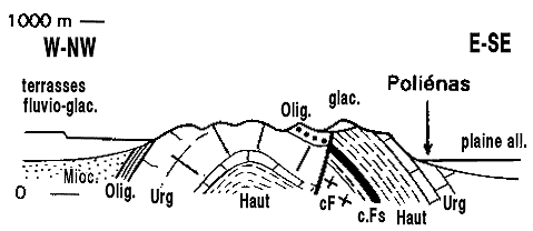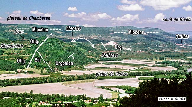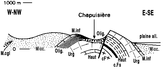 Ce fait indique que, selon toute vraisemblance, les dépôts oligocènes se sont accumulés là en s'appuyant sur un abrupt qui devait être constitué par celui de la lèvre orientale - soulevée - de la faille de Chapuisière. En outre on peut penser que les brèches qu'ils contiennent correspondent à des éboulis tombés de cet abrupt. Cette faille de Chapuisière a donc sans doute fonctionné à l'Oligocène et a, en tous cas, été cachetée* à cette époque (avant même que la voûte du pli soit ennoyée sous les dépôts molassiques de la mer miocène).