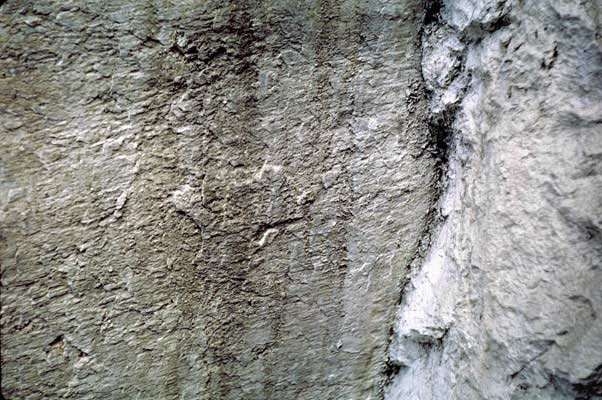 ![]() Vue rapprochée du miroir de faille de la faille des Balmes (La surface visible est de l'ordre de 2 m2) La quasi horizontalité des stries est caractéristique d'un décrochement. Les flèches indiquent la direction et le sens relatif du déplacement des deux compartiments : le compartiment sud-est, déplacé vers la gauche est à l'avant droit : ce sens de mouvement est déduit de la disposition des écailles calciteuses, collées au compartiment nord-ouest (elles ont leur abrupt du côté gauche). |