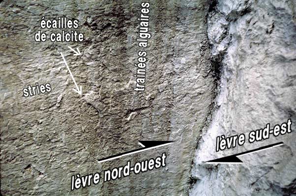 Mais surtout le rejet essentiellement coulissant est confirmé par l'étude rapprochée du miroir de faille. Ce dernier présente en effet un très bel enduit d'écailles de friction calciteuses imbriquées et garnies de stries, dont l'examen rapproché confirme un mouvement presque horizontal de sens dextre.
