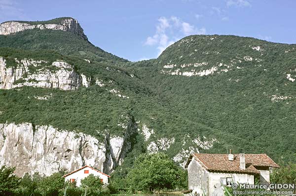 Concernant la constitution stratigraphique des abrupts, au nord de la faille, elle est la même que sur la rive opposée de l'Isère, au Bec de l'Échaillon, c'est-à-dire que la succession du Jurassique supérieur et du Crétacé inférieur y est du type jurassien riche en faciès calcaires, de plateforme, et très pauvre en faciès marneux de mer plus profonde. Il est à noter que les faciès franchement récifaux de la falaise des Balmes font place ici, vers le nord, à des calcaires plus lités de plateforme plus interne, qui sont exploités dans la grande carrière de La Buisse. |