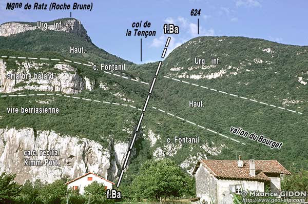 Cette déduction est confirmée par les observations que l'on peut faire plus à l'est, en comparant les deux lèvres de la cassure d'un bout à l'autre de son tracé, depuis plaine alluviale de l'Isère, où il détermine d'abord un vallonnement qui s'élève jusqu'au replat de la Tençon ; puis il franchit l'échine cotée 624 en déterminant le petit col 628 (où l'Urgonien supérieur bute contre l'Hauterivien inférieur), traverse à flanc de pente le versant de Rochebrune et se perd enfin sous les alluvions quaternaires du vallon de Pommiers à hauteur de ce village.