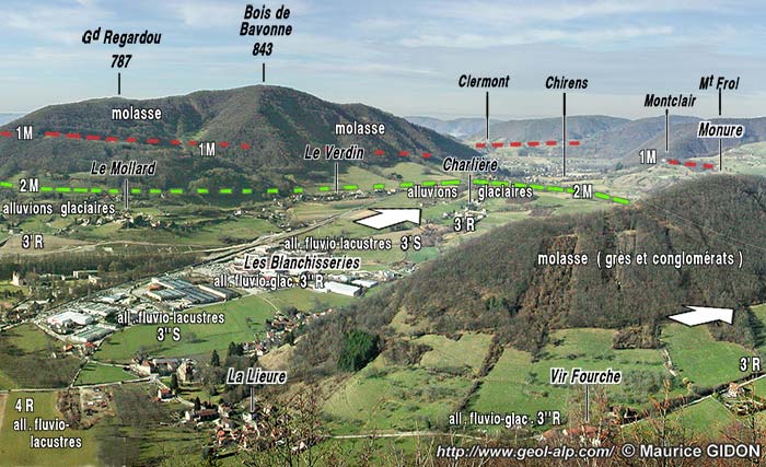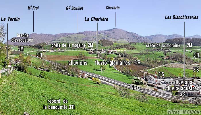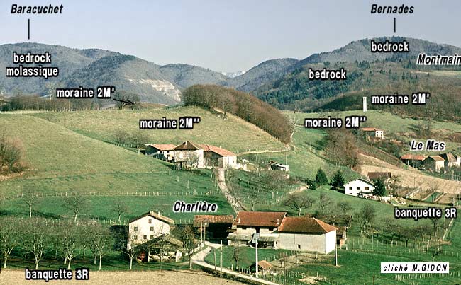 ![]() Détail du rebord interne du vallum morainique du Verdin, vu du sud-ouest, depuis les pentes du Bois de Bavonne, entre Le Verdin et Le Mollard. La crête morainique est double, formée par l'accolement de 2M' et de 2M'', la première se situant un peu plus à l'extérieur du vallum (plus au nord) et s’élevant un peu plus haut, mais la seconde la masquant souvent. La banquette située en contrebas, du côté sud, où se trouvait le glacier, est la première d'une succession de 3 à 4 banquettes qui se sont étagées pendant le retrait correspondant à l'épisode 3. À l'arrière-plan on distingue, au sein du bedrock qui émergeait des glaces, même au maximum de l'extension du glacier würmien, la falaise de conglomérats molassiques qui domine Saint-Nicolas-de-Macherin. |