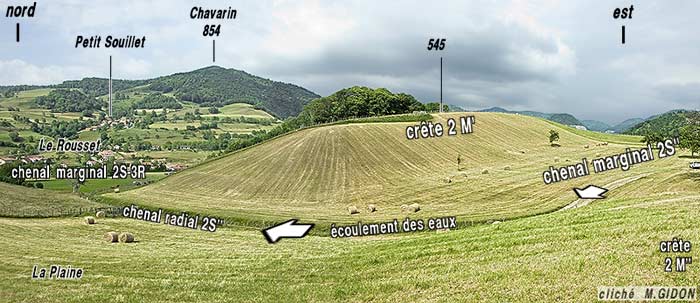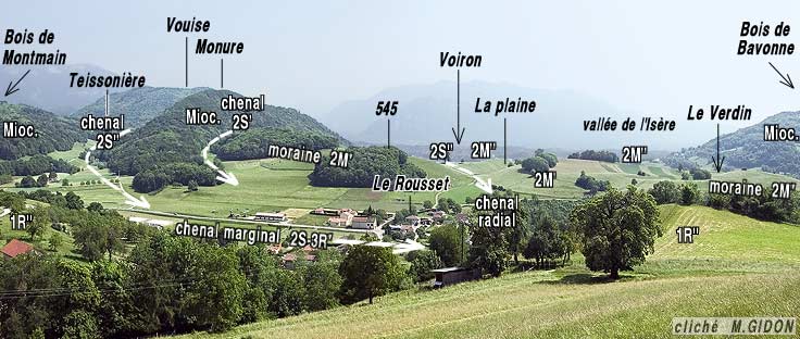 On observe encore clairement les brèches ont été ouvertes dans la crête morainique par les eaux de fonte du glacier isérois pour s'échapper de ce vallum : un bel exemple est celle de "la Plaine", d'où part un chenal radial (perpendiculaire au front glaciaire) qui rejoignait le chenal marginal du Rousset.