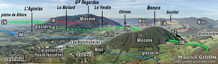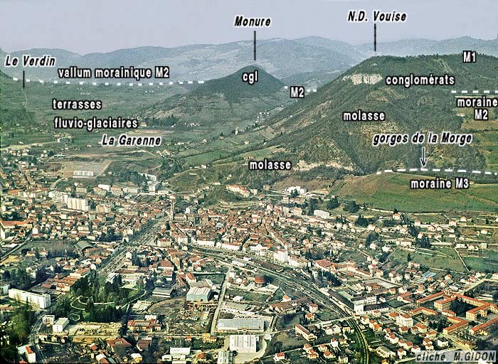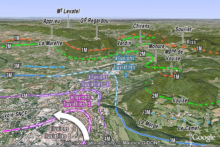 La bordure orientale de la cuvette de Voiron montre par contre les traces de ces occupations successives par le glacier würmien, avec ses alternances de moraines et de terrasses alluviales, étagées chacune à son niveau respectif, qui s'appuient là sur le bedrock molassique de la montagne de Vouise (plus de détails aux pages "Verdin" et "Vouise")