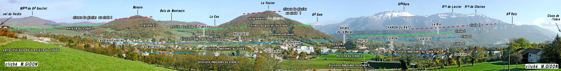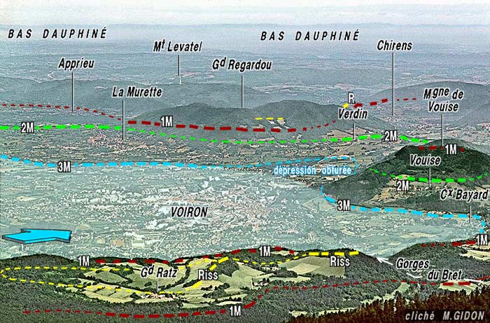 ![]() Panorama de la bordure nord-ouest de la cuvette de Voiron, vu du sud-est, depuis le sommet de la montagne de Vouise. Les crêtes de moraines conservées sont marquées de tirets de couleur continus. Les tirets espacés indiquent la position atteinte par le front glaciaire du stade correspondant, dans les secteurs où les crêtes morainiques sont effacées. (plus de détails à la page "Verdin") |