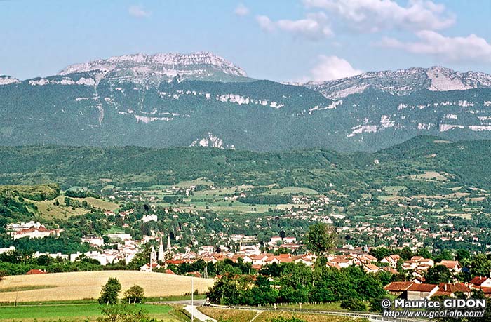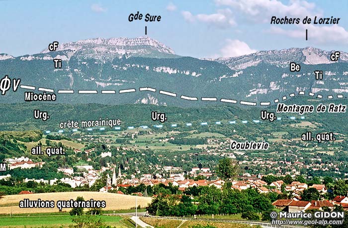 ![]() Voiron et la bordure occidentale de la Chartreuse, vus de l'ouest, depuis les collines dominant la ville (Charauze). ØV = chevauchement de Voreppe, représentant la limite structurale du massif de la Chartreuse (et plus largement des massifs subalpins septentrionaux). Le Miocène du synclinal de Voreppe (marge la plus orientale du sillon molassique péri-alpin) n'apparaît que difficilement, par dessus la voûte urgonienne du mont anticlinal de Ratz. On a souligné d'un tireté cerné de bleu la ligne de crête de la moraine de la 2° étape de retrait du glacier würmien, qui court à flanc de la montagne de Ratz. Elle descend doucement vers l'est car elle correspond au bord méridional d'une langue glaciaire diffluente qui s'avançait, vers la gauche, jusqu'à Saint-Étienne de Crossey (voir la carte). |