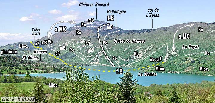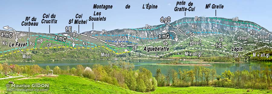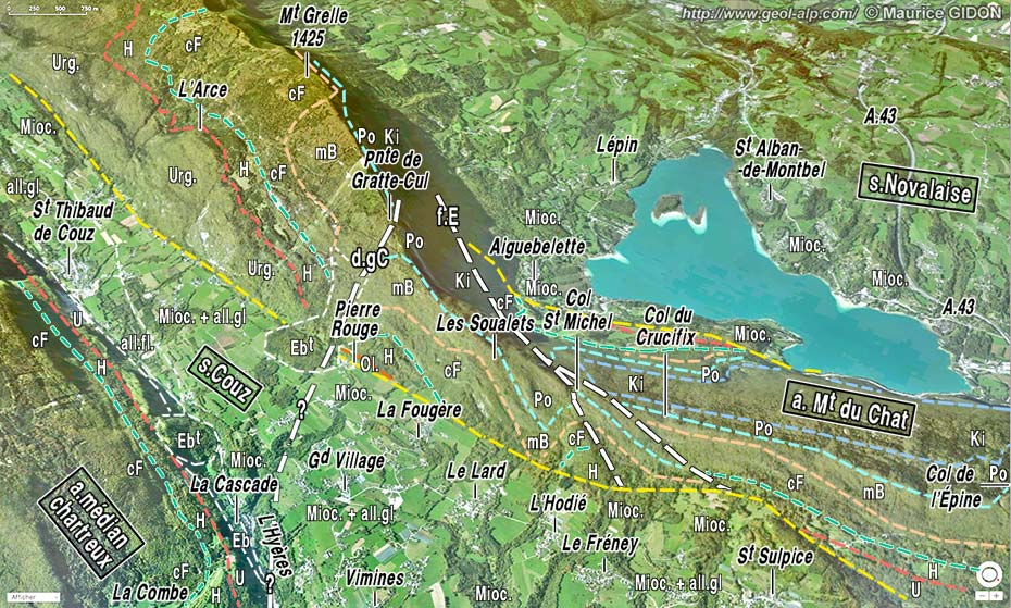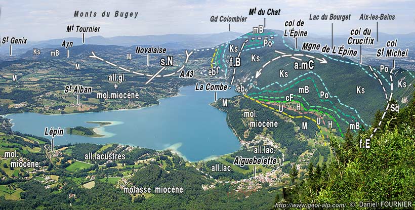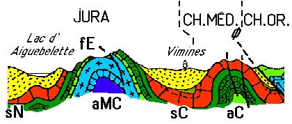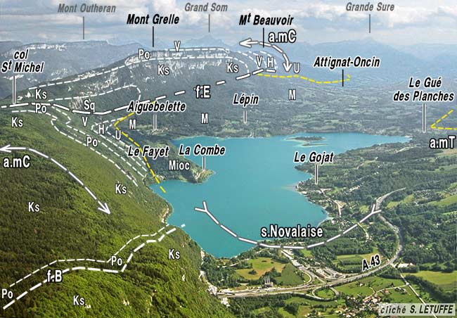 ![]() Cette coupe passe à mi-distance des extrémités nord et sud du lac d'Aiguebelette (à la latitude du Fayet et du col Saint-Michel). s.N = synclinal de Novalaise (branche occidentale du prolongement septentrional du synclinal de Voreppe) ; a.MC = anticlinal du Mont du Chat ; s.C = synclinal de Couz (branche orientale du prolongement septentrional du synclinal de Voreppe). f.E = faille de L'Épine. |