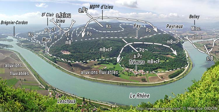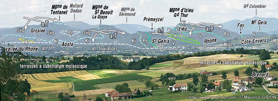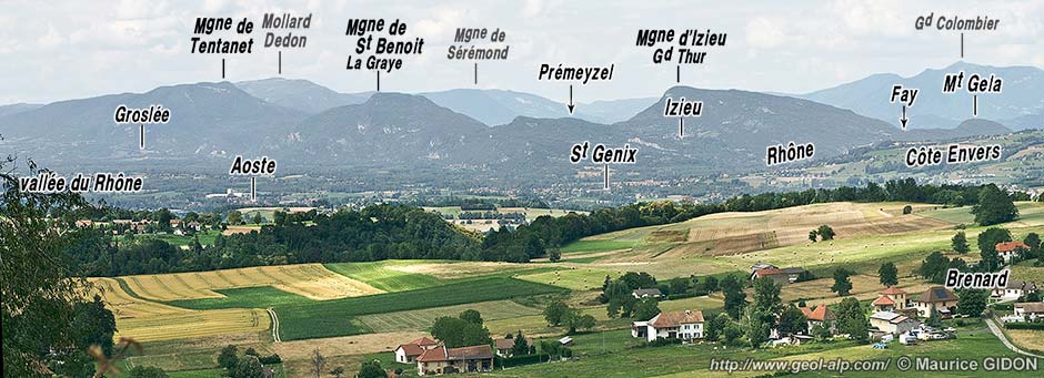 ![]() L'extrémité sud-orientale des chaînons du Bugey occidental, vue du sud depuis les environs du village du Sougey (à l'est des Abrets). a.T = anticlinal de Tentanet (éventré par l'érosion à l'est de Groslée : le Bathonien de son cœur y arme l'échine du Mont Pela, qui est un modeste mont dérivé) ; s.I = synclinal d'Izieu ; a.P = anticlinal de Prémeyzel. Tous ces plis ont leurs axes qui plongent vers le SE, de sorte que leur voûte s'ennoie dans cette direction, dès la latitude de Saint-Genix, sous le Miocène du Bas Dauphiné. Toutefois la surface de transgression des molasses miocènes est masquée sous les alluvions du Rhône (elle est visible plus à l'est dans le versant sud du Mont Tournier). |