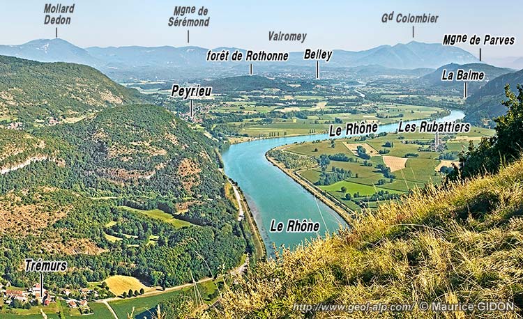 À l'est de la barrière constituée par ces chaînons, le cours du Rhône, qui rejoint sa dérivation à Virignin, au sortir de la cluse de La Balme s'écoule du Nord vers le Sud en suivant à peu le flanc oriental du synclinal de Belley. En effet si le tracé du lit du Rhône est affecté d'amples méandres, le bord oriental de sa plaine alluviale longe sensiblement de façon rectiligne le pied des escarpements du crêt du Mont Tournier ; elle y masque presque partout la retombée ouest des couches affectées par l'anticlinal qui arme ce chaînon (voir la page "Mont Tournier").