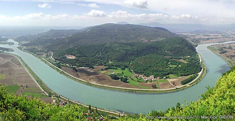Cette partie N-S du cours du Rhône se termine peu au nord de Saint-Genix-sur-Guiers. à la latitude du sommet du Mont Tournier : le lit du Rhône s'y coude à 90° vers l'ouest en contournant , au village de Trémurs, l'éperon rocheux que constitue, en rive droite l'échine orientale du Mont Gela, dernier relief de la montagne d'Izieu.