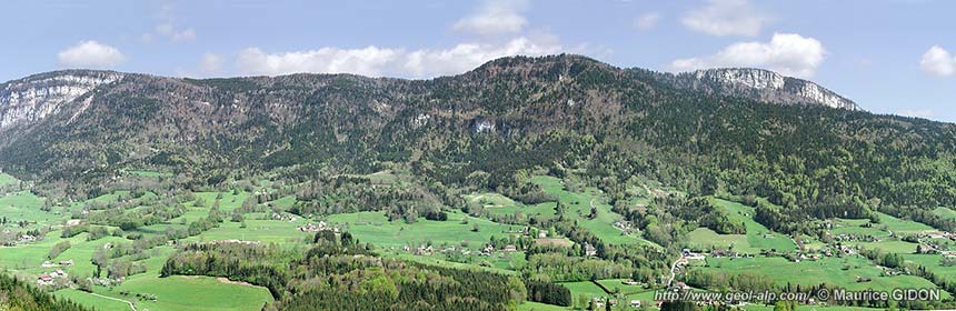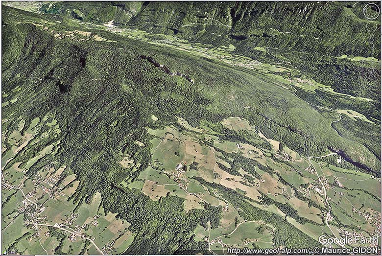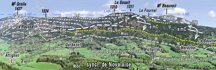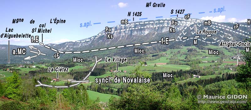![]() Le Mont Grelle, versant occidental, vu de l'ouest, depuis la colline 595 au nord du village de Gruat (commune d'Attignat-Oncin) f.E = faille de L'Épine (elle est cachée sous la jupe d'éboulis et, à la latitude d'Attignat, sous le paquet effondré de La Rousse) ; a.MC = anticlinal du Mont du Chat (partie septentrionale) ; s.apl. = position approximative de la surface d'aplanissement datant du Quaternaire ancien. Le synclinal de Novalaise se raccorde plus au sud, à la latitude des Échelles, à la partie occidentale du synclinal de Voreppe (voir la page "Échelles"). |