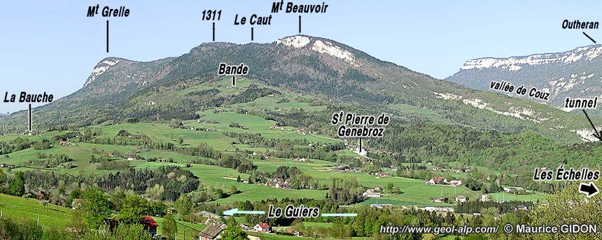 La coupe ci-après situe le chaînon jurassien du Mont Grelle, par rapport aux chaînons subalpins. Il est directement en contact vers l'est avec le chaînon de la Chartreuse médiane car, à cette latitude, le chaînon de la Chartreuse occidentale a pratiquement disparu du fait de son amortissement progressif, vers le nord, dans le synclinal de Couz.