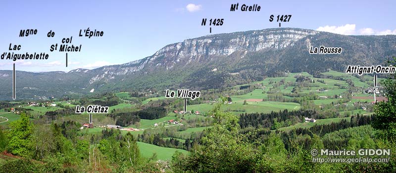 A la latitude d'Attignat-Oncin le versant occidental Mont Grelle se révèle affecté par un chevauchement qui fait avancer vers l'ouest les couches du haut des escarpements, appartenant au flanc oriental de l'anticlinal du Mont Grelle sur celles, redressées à la verticale, du flanc ouest de ce pli. Il s'agit clairement de la réapparition de la faille de L'Épine (voir la page "Aiguebelette"), au sud de la longue interruption d'affleurements que détermine la longue jupe d'éboulis qui garnit le pied des falaises (celle-ci se termine par le gros talus boisé de La Rousse qui correspond très vraisemblablement, quant à lui, à un tassement du versant).