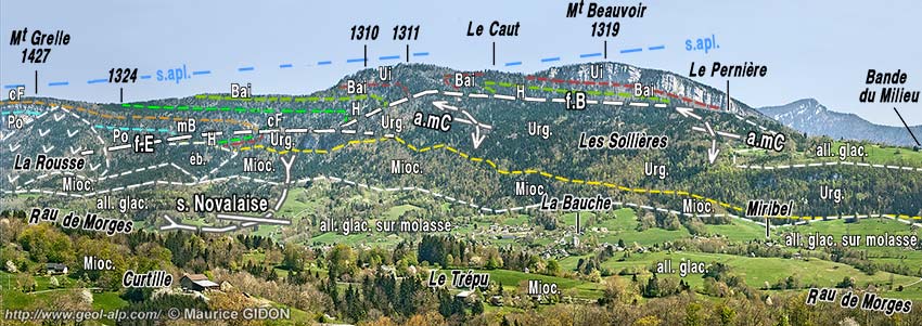 Le Mont Grelle lui même est, à peu de chose près, un mont jurassien*, mieux encore que le Mont du Chat car l'entaille d'érosion du flanc ouest de l'anticlinal s'y réduit fortement et l'on y voit les couches basculer progressivement vers l'ouest. La voûte anticlinale du pli est encore décapée du côté nord jusqu'au niveau des "marbres bâtards" du Crétacé inférieur, mais, à la faveur du plongement axial du pli vers le sud, on y voit réapparaître successivement, du nord vers le sud, les calcaires du Fontanil, l'Hauterivien puis l'Urgonien qui couronne la crête à partir du Mont Beauvoir.