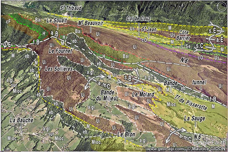 Plus au sud ce chevauchement court au pied des escarpements du versant en laissant réapparaître dans sa lèvre inférieure l'Urgonien du flanc oriental du synclinal de Novalaise. Ce dernier affleure de plus en plus largement en direction du Sud et forme, bien avant La Bauche, les dalles structurales fortement pentée du flanc ouest de l'anticlinal du Mont du Chat. Il semble que le chevauchement s'amortit dans ce versant, mais la couverture boisée et les placages d'alluvions glaciaires ne permettent pas d'y analyser comment la surface de cassure y disparaît. En tous cas, au flanc nord de l'échine du Fournel, qui descend vers l'ouest depuis le sommet 1311 du Souait, cette surface de chevauchement se raccorde à l'extrémité septentrionale de la faille du Mont Beauvoir. La surface de cassure de cette dernière, beaucoup plus proche de la verticale, y tranche en biais la charnière en genou, déjetée vers l'ouest, de l'anticlinal du Mont du Chat, qui est bien dessinée par les couches urgoniennes.