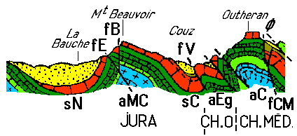![]() Coupe à la latitude de Saint-Jean-de-Couz s.N = synclinal de Novalaise (terminaison vers le nord de la partie occidentale du synclinal de Voreppe) ; f.E = faille de L'Épine (ici fortement atténuée) ; a.MC = anticlinal du Mont du Chat - L'Épine ; f.V = faille de Voreppe (son rejet est ici très atténué par rapport à ce qu'il est plus au sud) ; f.B = faille du Mont Beauvoir ; a.Eg = anticlinal des Égaux (terminaison septentrionale de l'anticlinal de la Chartreuse occidentale). ; a.C = anticlinal du Couvent (= anticlinal de la Chartreuse médiane) ; f.CM = faille du col du Mollard. |