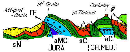 ![]() Coupe à la latitude de Saint-Thbaud-de-Couz Cette coupe passe 5 kilomètres plus au sud que celle du lac d'Aiguebelette s.N = synclinal de Novalaise (branche occidentale du prolongement septentrional du synclinal de Voreppe) ; f.E = faille de L'Épine ; a.MC = anticlinal du Mont du Chat ; s.C = synclinal de Couz (branche orientale du prolongement septentrional du synclinal de Voreppe). |