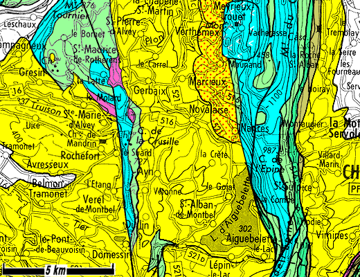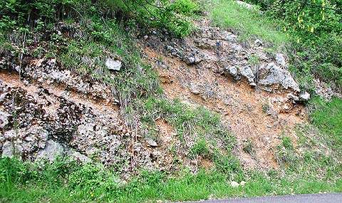Toutefois cette faille ne se prolonge pas dans le versant à l'est de Grésin : en effet la route D.42 y montre sans ambiguïté le repos stratigraphique du Miocène sableux sur les calcaires du Fontanil, par l'intermédiaire de conglomérats oligocènes épais de quelques mètres. |
