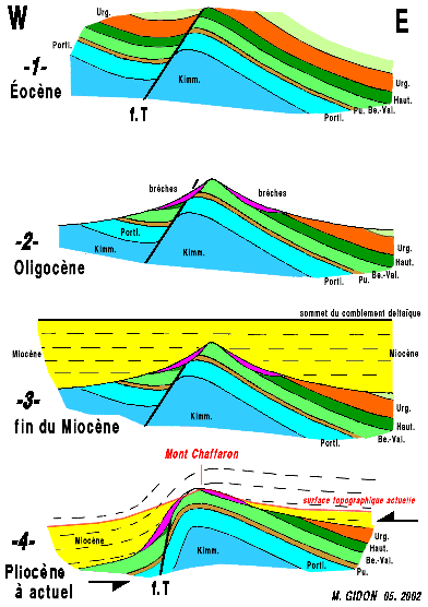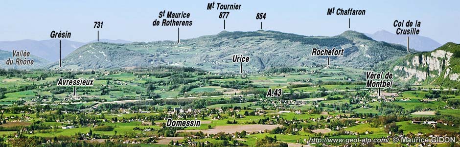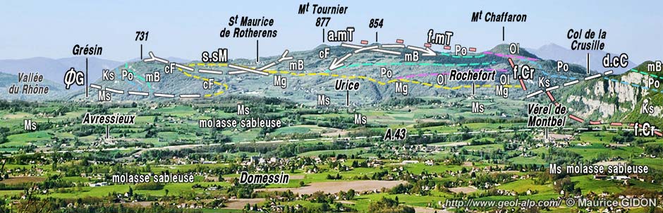 La ligne de crête est sensiblement suivie également par le tracé de la faille du Mont Tournier. qui s'avère être une cassure extensive à lèvre occidentale abaissée (ce rejet se voit surtout à l'extrémité NW de son tracé dans l'entaille de la vallée du Rhône : voir le cliché plus loin dans cette page). Cette cassure semble avoir eu une activité plus précoce, oligocène, car elle disparaît, à l'extrémité méridionale de son tracé sous les conglomérats à ciment rouge, d'âge oligocène, du Mont Chaffaron. Au-delà de ce sommet il est vraisemblable qu'elle se prolonge par la faille de la Crusille, car le tracé de cette dernière, franchement N-S, ne diverge du sien que de 30°).