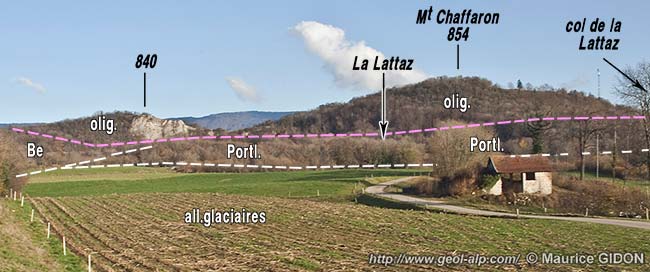 L'échine du Mont Tournier se poursuit vers le sud en s'accidentant, avant le col de La Lattaz par la butte du Mont Chaffaron. Ce petit sommet est formée par des conglomérats rouges lités et pentés faiblement vers l'est quel'on rapporte à l'oligocène.