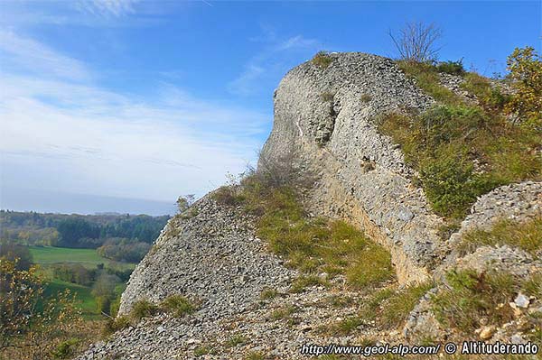 L'antécime nord du Mont Chaffaron (point 840), vu du SE. Deux bancs de conglomérats pentés vers l'est, séparés par un lit à ciment marneux rubéfié. |