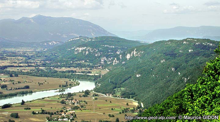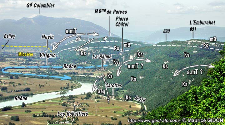 Au nord du sommet le flanc occidental de ce pli est enlevé par l'érosion de la vallée du Rhône et l'on ne trouve notamment aucun témoin de sa retombée au pied des escarpements, à la latitude de Loisieux et de la Montagne de l'Emburchet. Il faut aller assez au nord de la cluse de La Balme, jusqu'à Coron à la latitude de Belley, pour commencer à leur voir dessiner un anticlinal en genou déjeté vers l'ouest en y retrouvant des affleurements de ce flanc du pli qui ne sont pas masqués par les alluvions.