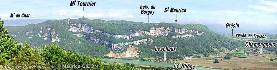 Du côté occidental du sommet les abrupts qui dominent la vallée du Rhône sont couronnés par les couches presque horizontales du Crétacé inférieur (marbre Bâtard) et du Jurassique supérieur (les plus anciennes sont les calcaires récifaux du Kimméridgien, mais un tout petit affleurement de Séquanien émerge cependant au pied des éboulis qu'entaille profondément la carrière de Leschaux). Ces couches ont au sommet des falaises un pendage vers l'ouest, ce qui est l'amorce d'une charnière que l'on peut désigner sous le nom d'"anticlinal du Borgey" car elle est séparée de celui du Mont Tournier par l'ondulation synclinale de Saint-Maurice de Rotherens.