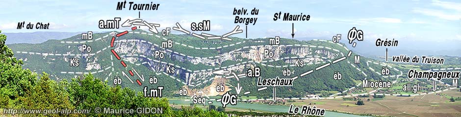 La cause de la surélévation du Jurassique du plateau de Saint-Maurice de Rotherens par rapport au Crétacé qui affleure à peu de distance de l'autre côté de la vallée du Rhône (à Trémurs notamment) n'est pas évidente, car le pied de ses abrupts est masqué par une forte jupe d'éboulis qui rejoint les alluvions du lit du Rhône (voir la page "Izieu"). Toutefois il est assez clair que le tracé de la faille de Grésin doit se prolonger sous les éboulis jusqu'à la latitude de Leschaux, puis au-delà passer, masquée, sous le lit du Rhône : cela indique qu'à cette latitude le flanc ouest du chaînon du Mont Tournier est rompu par un chevauchement qui lui fait recouvrir l'extrémité SE de l'anticlinal de Prémeyzel.